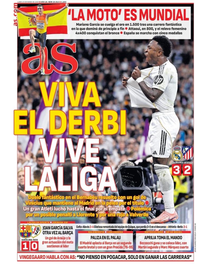 Por parte del AS, el diario saca en primera plana también a Vini, quien ha encendido a todos los fans del conjunto merengue en un partido épico repleto de goles y con remontada incluida.