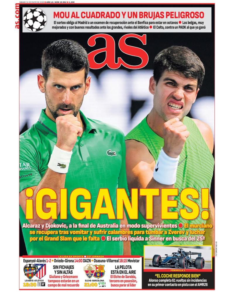 Por parte del AS, destacan en su portada la final del Open de Australia entre Carlos Alcaraz y Novak Djokovic. También el sorteo de Champions en el que el Real Madrid tendrá que enfrentarse nuevamente al Benfica de José Mourinho.