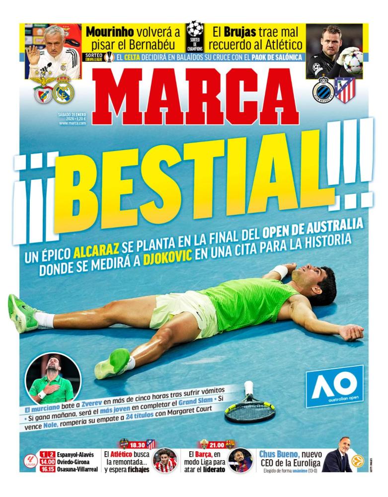 El diario Marca saca en primera plana la victoria de Carlos Alcaraz sobre Zverev a cinco sets para llegar a la final del Open de Australia. Asimismo, también destacan la vuelta de José Mourinho al Estadio Santiago Bernabéu, ya que se enfrentará al Real Madrid en dieciseisavos de la Champions League.