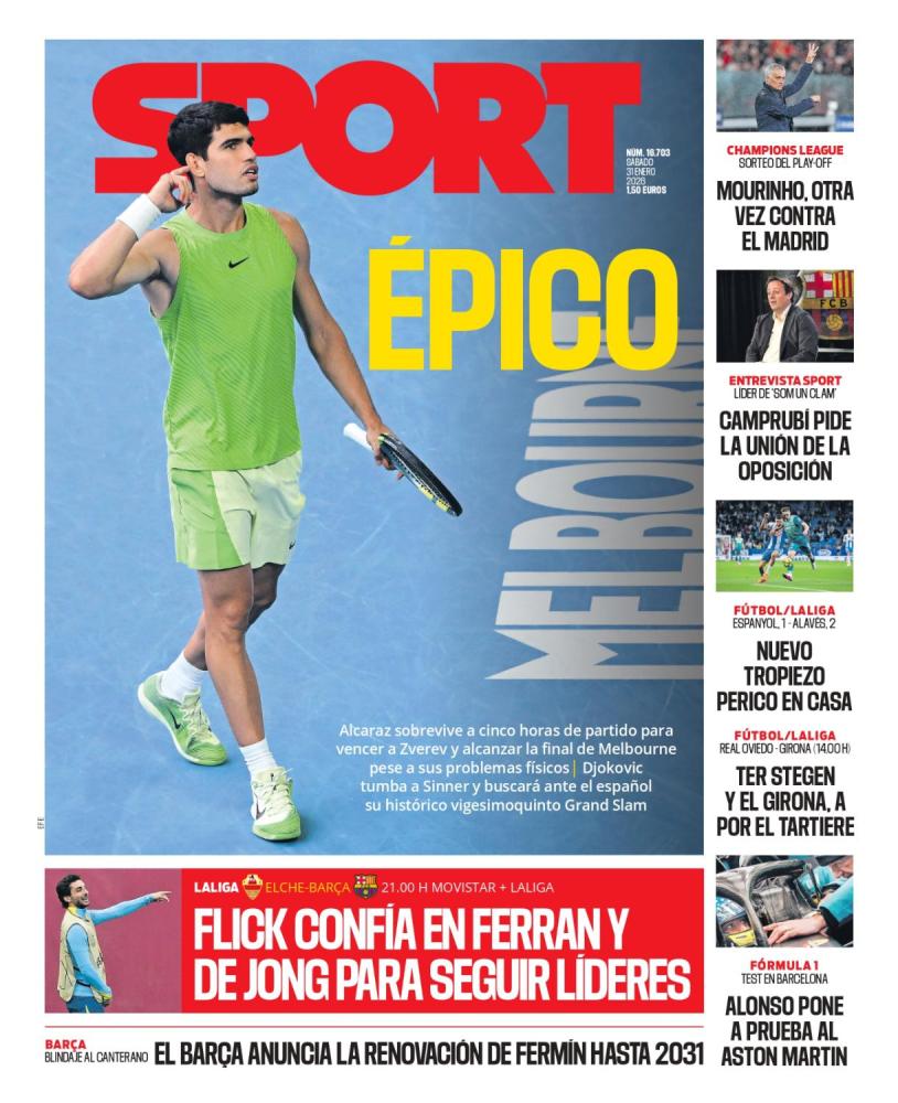 Sport pone de protagonista a Carlos Alcaraz tras alcanzar la final del Open de Australia, así como el Sorteo de Champions con el Real Madrid y José Mourinho como principales figuras.