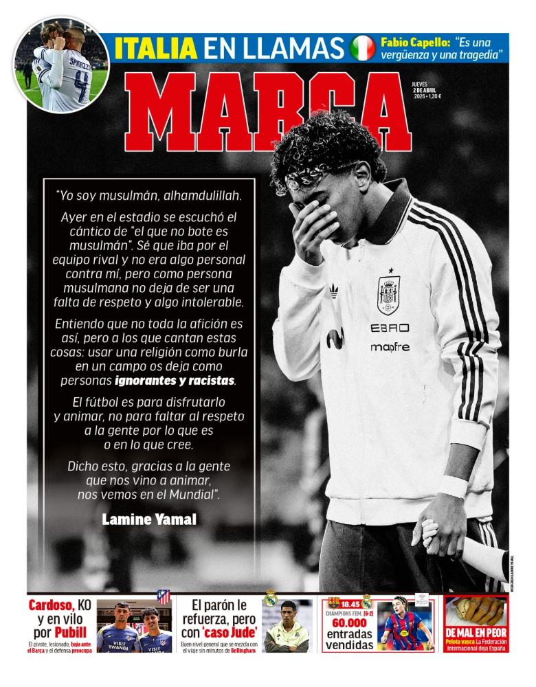 Marca destaca en su portada el comunicado que publicó Lamine Yamal en el día de ayer para dar su opinión sobre lo que ocurrió en el partido amistoso que enfrentó a España con Egipto.
