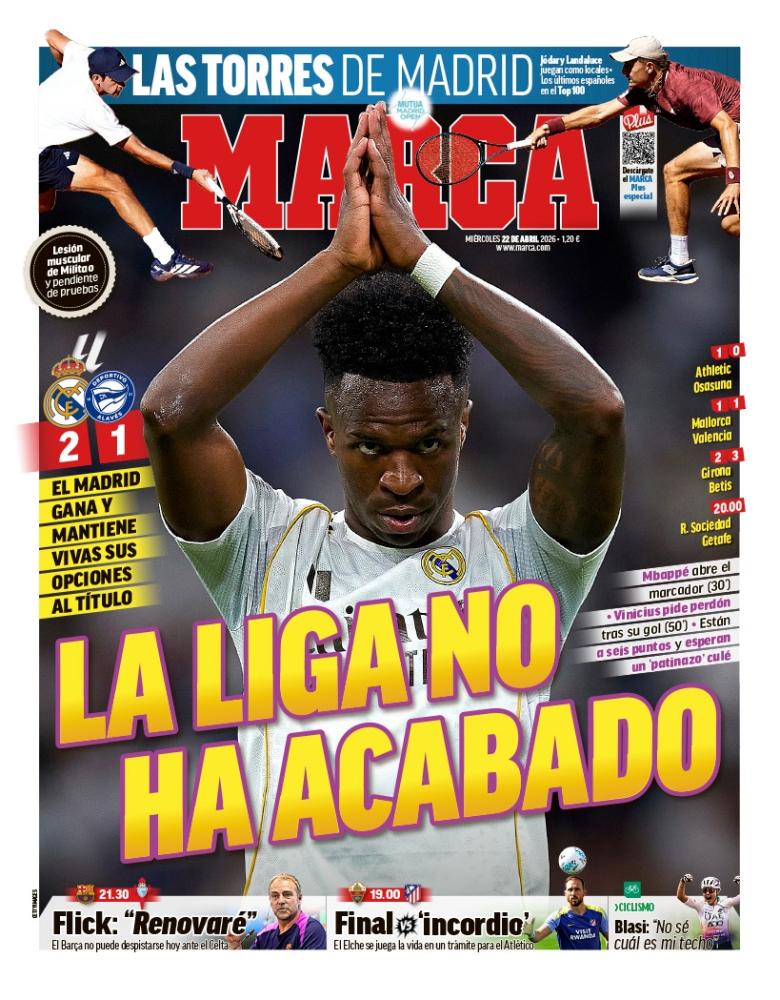 Marca destaca en su portada el hecho de que la liga no ha acabado todavía, y es que la victoria de anoche por la mínima ante el Alavés es suficiente motivo para seguir creyendo la posibilidad de remontar una liga que podría ser histórica.