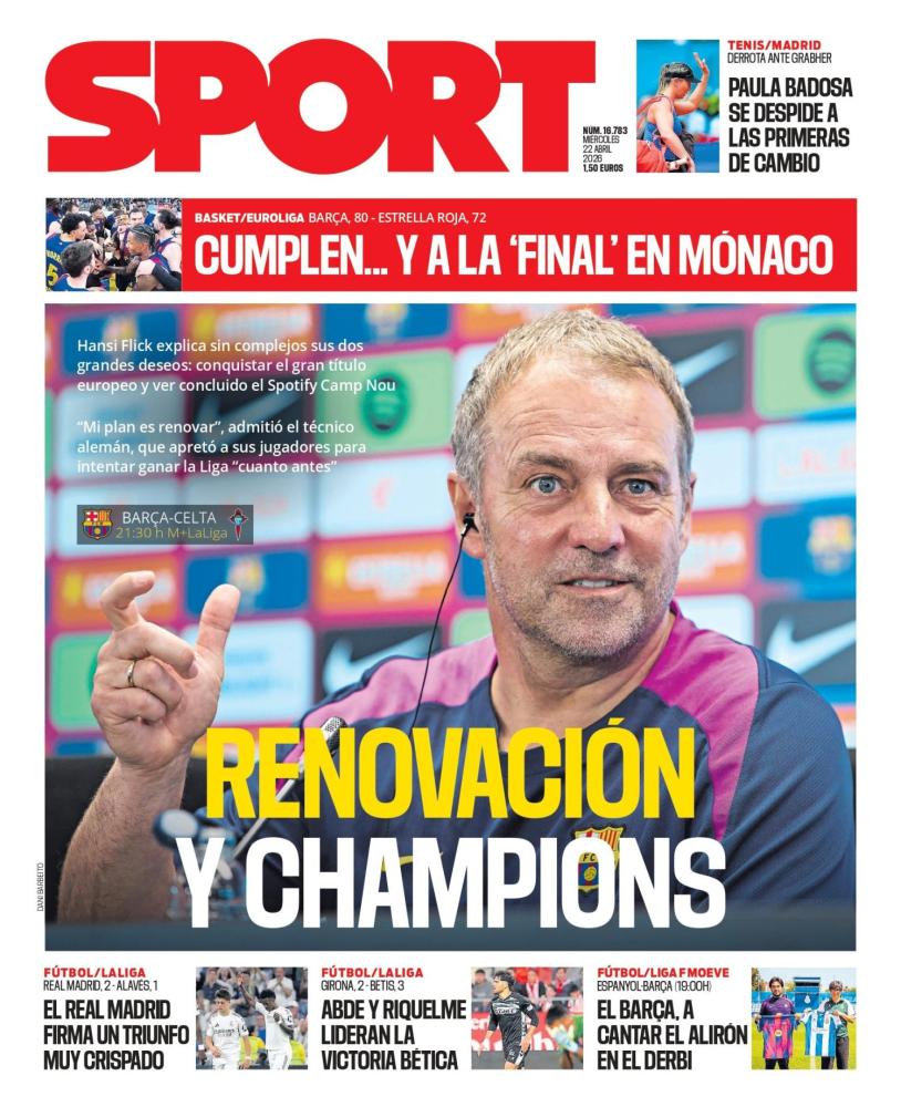 Sport pone como principal protagonista a Hansi Flick, quien podría renovar con el FC Barcelona ya que estaría deseando conseguir levantar la ansiada sexta Champions League para el equipo culé y ya sueña con ella.