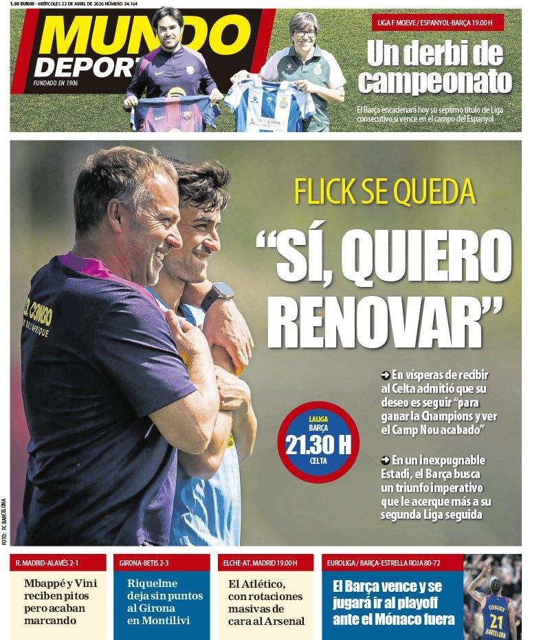El Mundo Deportivo hace hincapié en primera página las declaraciones claras y concisas del entrenador del Barça que ha confirmado en rueda de prensa que sí que quiera renovar con el club, algo que a buen seguro habrá gustado a Joan Laporta.