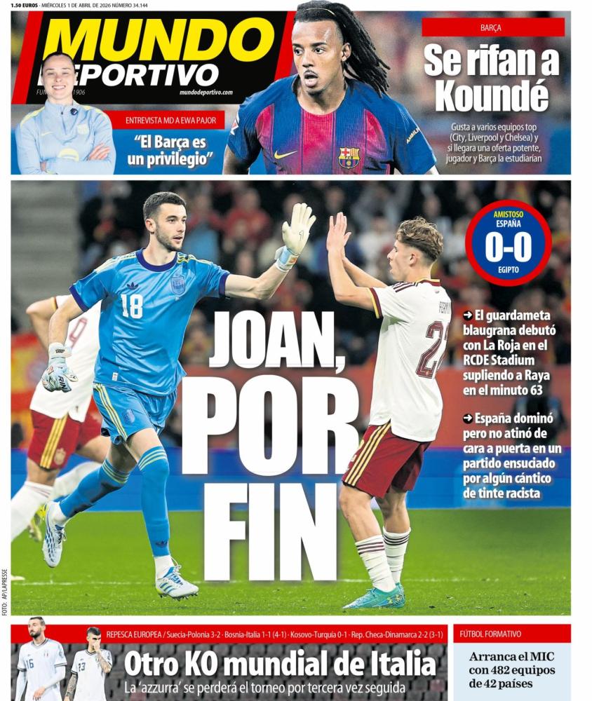 Sport pone como principal protagonista a Joan García, quien anoche debutó como jugador de la selección española entre pitos al entrar al partido a 30 minutos de finalizar el partido.