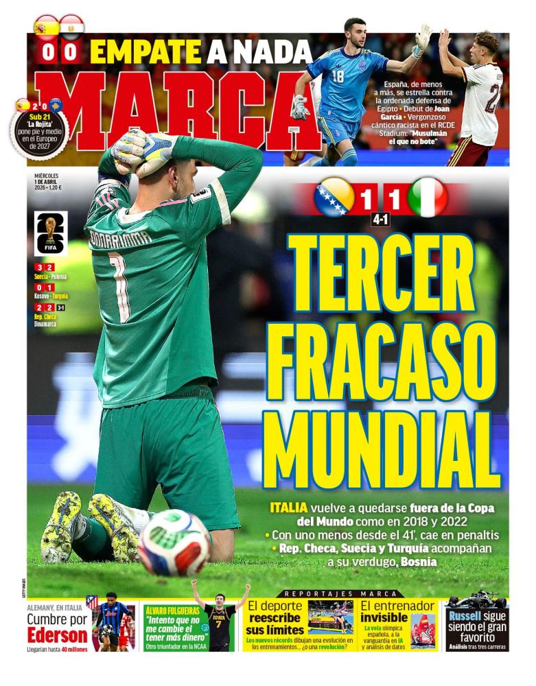 Marca destaca en su portada el hundimiento que sufrió anoche Italia al perder el pase al mundial en la tanda de penaltis. Es el tercer campeonato de selecciones del mundo al que no acuden de manera consecutiva.