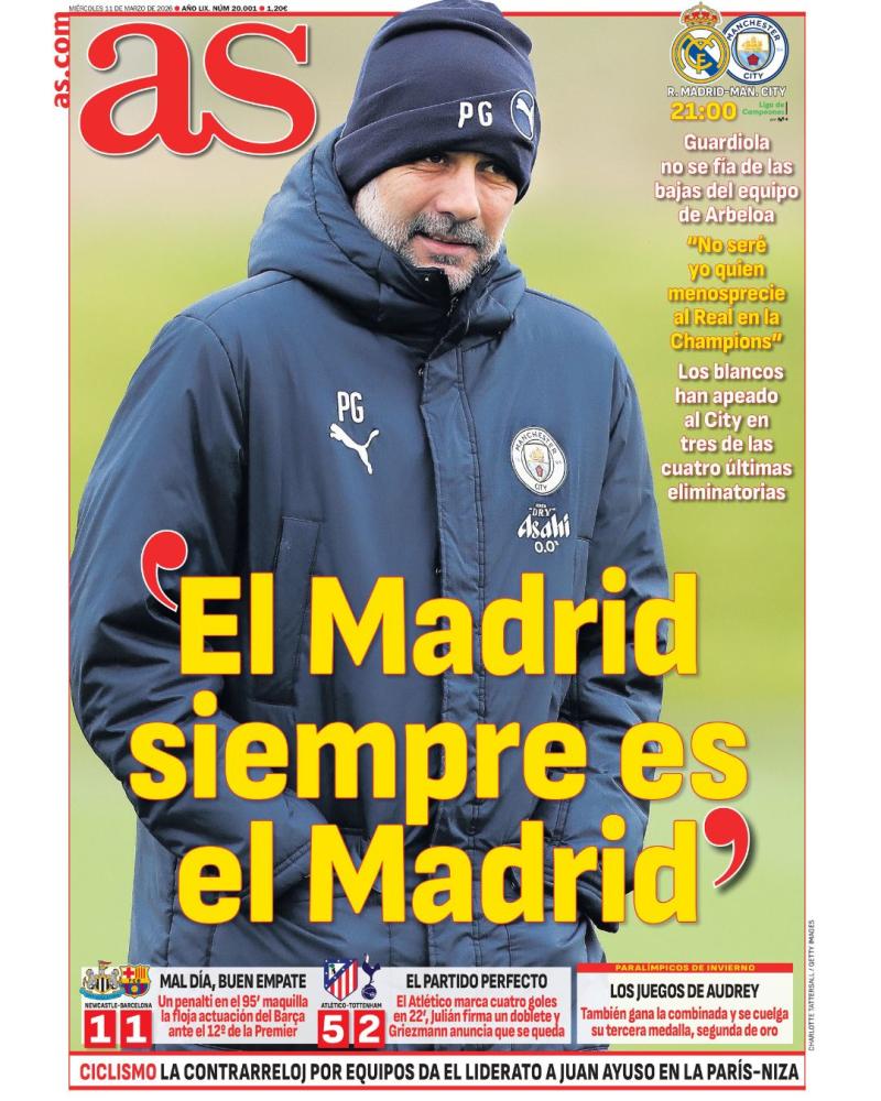 Por parte del AS, el diario saca en primera plana las declaraciones que hizo ayer Pep Guardiola al ser preguntado en rueda de prensa previa al partido que enfrentará a su equipo con el Real Madrid. El técnico no se fía y teme lo peor con unas palabras premonitorias: "El Madrid siempre es el Madrid, comentó el catalán.
