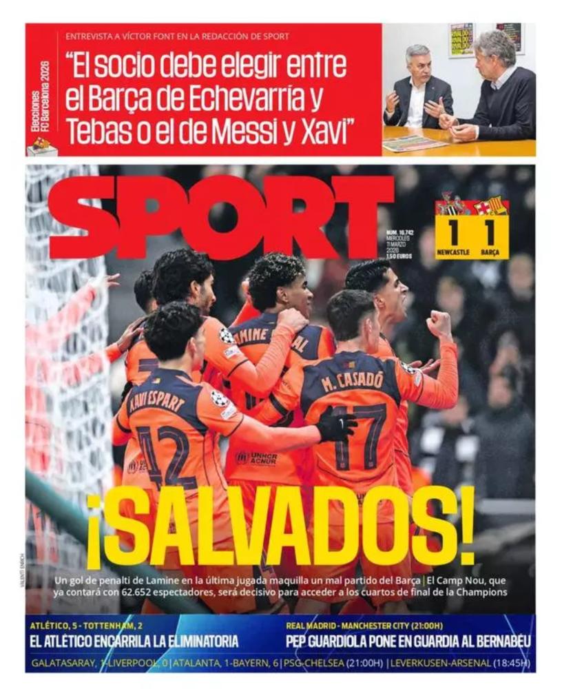 Sport pone como principal información la crónica del partido que enfrentó al FC Barcelona contra el Newcastle y donde solo se pudo rescatar un punto, haciendo énfasis en la importancia de marcar un penalti señalado sobre Dani Olmo en el minuto 96.