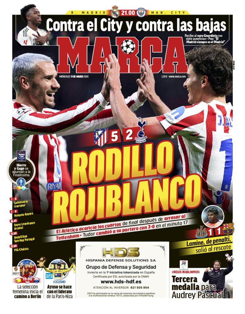 Marca destaca en su portada la gran victoria del Atlético de Madrid que consiguió una gran victoria en el Wanda Metropolitano tras arrasar al Tottenham por 5-2, logrando además ponerse tres goles por delante cuando el cronómetro solo marcó los 17 minutos desde el comienzo del encuentro.