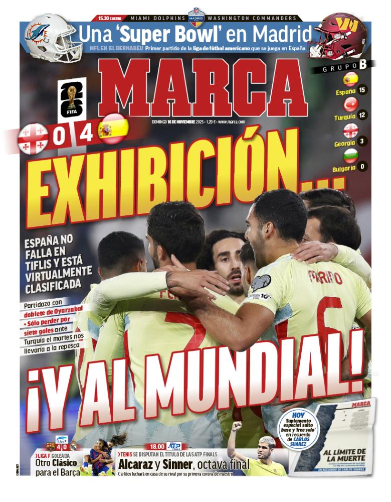 El diario Marca saca en primera plana para este domingo la clasificación virtual de España al Mundial de 2026 gracias a su goleada por 0-4 a Georgia, así como el primer partido de la NFL en el Estadio Santiago Bernabéu.