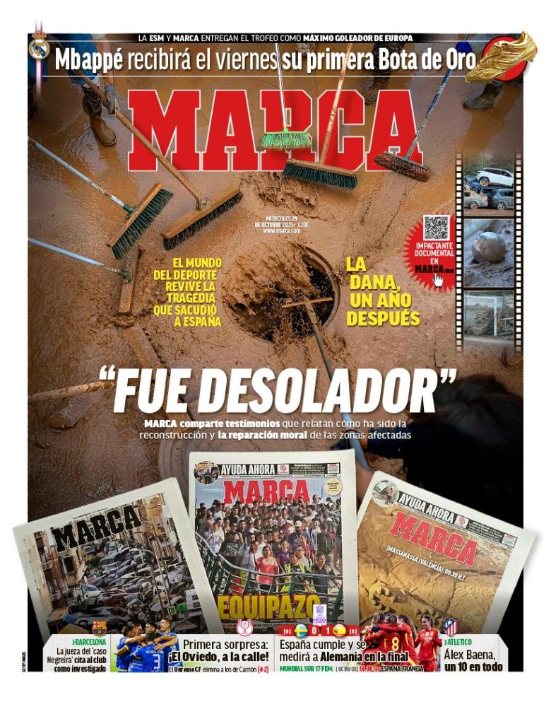 El diario Marca destaca en su portada del miércoles 29 de octubre el aniversario de la DANA y lo "desolador" que fue, tal y como indica el periódico, a la vez que Kylian Mbappé tiene su espacio de protagonismo con la recepción de su primera Bota de Oro.