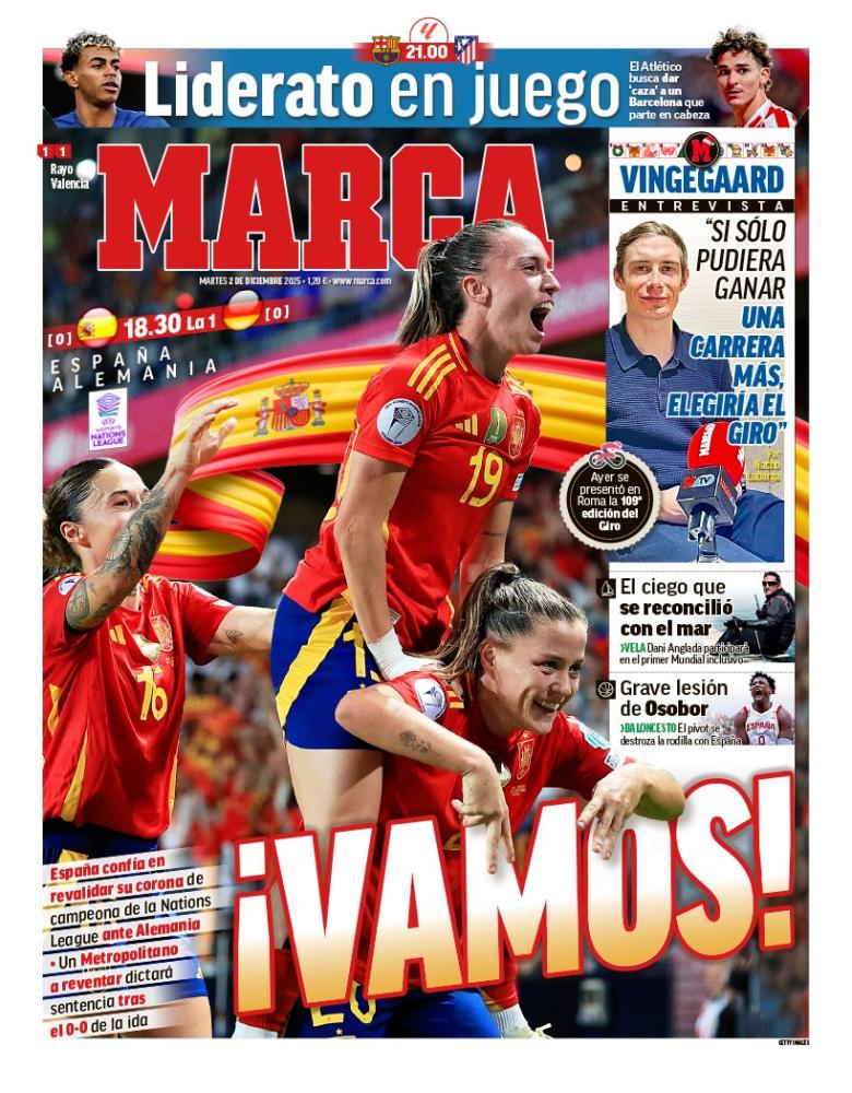 El diario Marca saca en primera plana del martes la final de la UEFA Nations League entre España y Alemania, así como la lucha por el liderato del Barcelona y el Atlético, que jugarán a las 21:00 de la noche para afianzarse en el primer puesto.