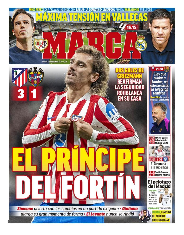 El diario Marca destaca en su portada la previa del Rayo - Real Madrid con muchas expectativas en un duelo de altos vuelos para los dos equipos. Por una parte, la bronca de Íñigo Pérez con Balliu, y por otra, la necesidad de victoria de Xabi Alonso tras el batacazo en Liverpool.