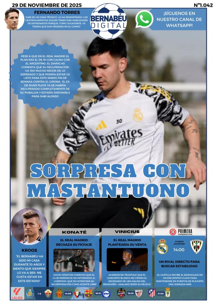 Bernabéu Digital destaca en su portada BD el inesperado regreso de Franco Mastantuono con el Real Madrid.
