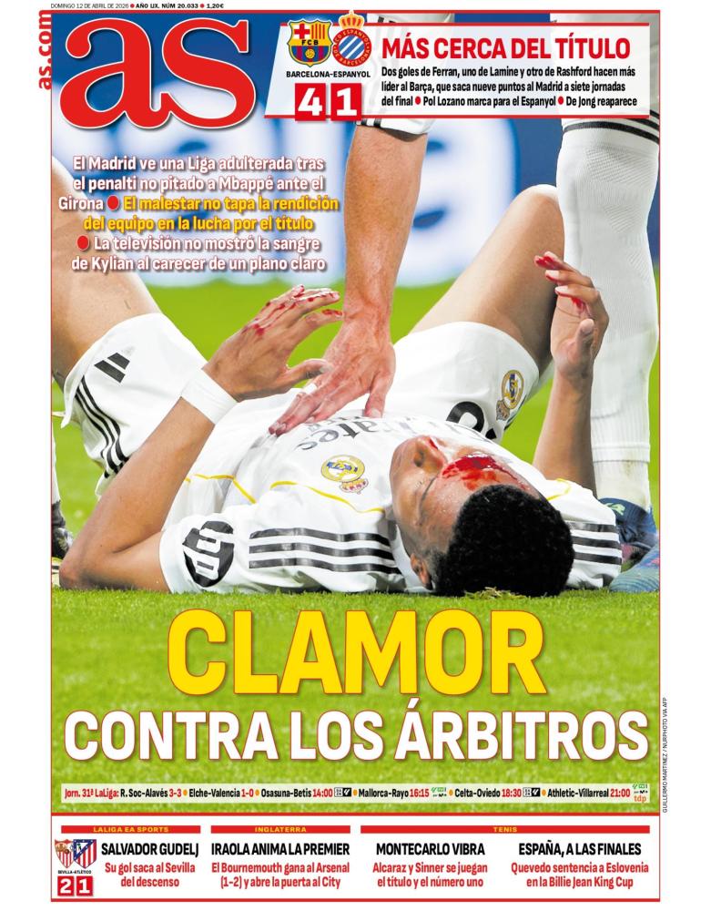 Por parte del AS, el diario saca en primera plana la polémica arbitral tras el penalti no pitado a Mbappé ante el Girona. El medio destaca que desde el club blanco ven una Liga adulterada por las actuaciones arbitrales.