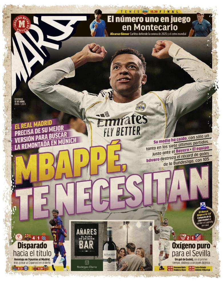 Marca destaca en su portada la necesidad de recuperar el mejor nivel de Mbappé tras unos últimos partidos más discretos en términos goleadores.