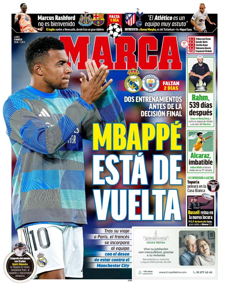 Marca destaca en su portada a Mbappé y su posible vuelta de cara al partido que enfrentará al Real Madrid contra el Manchester City en el cual el francés tendrá solo dos entrenamientos para probarse.