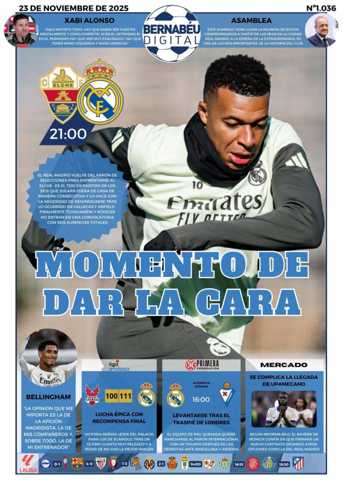 Bernabéu Digital destaca en su portada la previa del Elche - Real Madrid, con las declaraciones de Xabi Alonso en rueda de prensa. Además, también se hace hincapié en la victoria del equipo de Baloncesto.