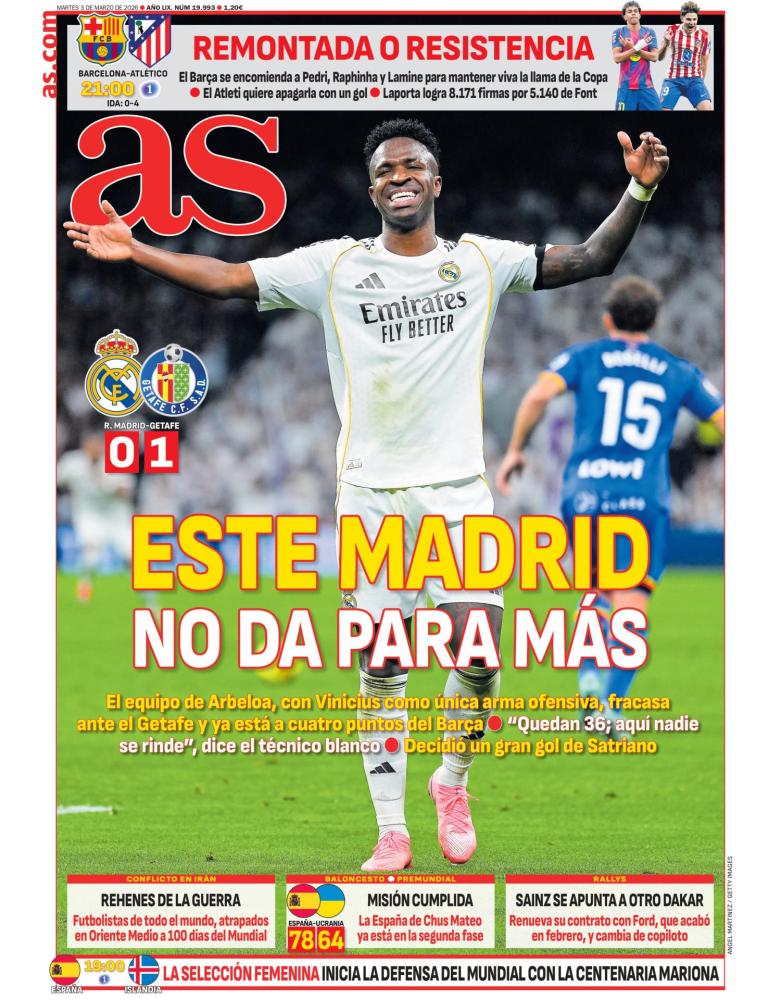 Las portadas deportivas de hoy destacan la derrota del Real Madrid ante el Getafe. En Marca lo titulan como "otro fiasco", mientras que en AS se limitan a asegurar que "este Madrid no da para más". En Sport van más allá y lo catalogan como "otro ridículo".