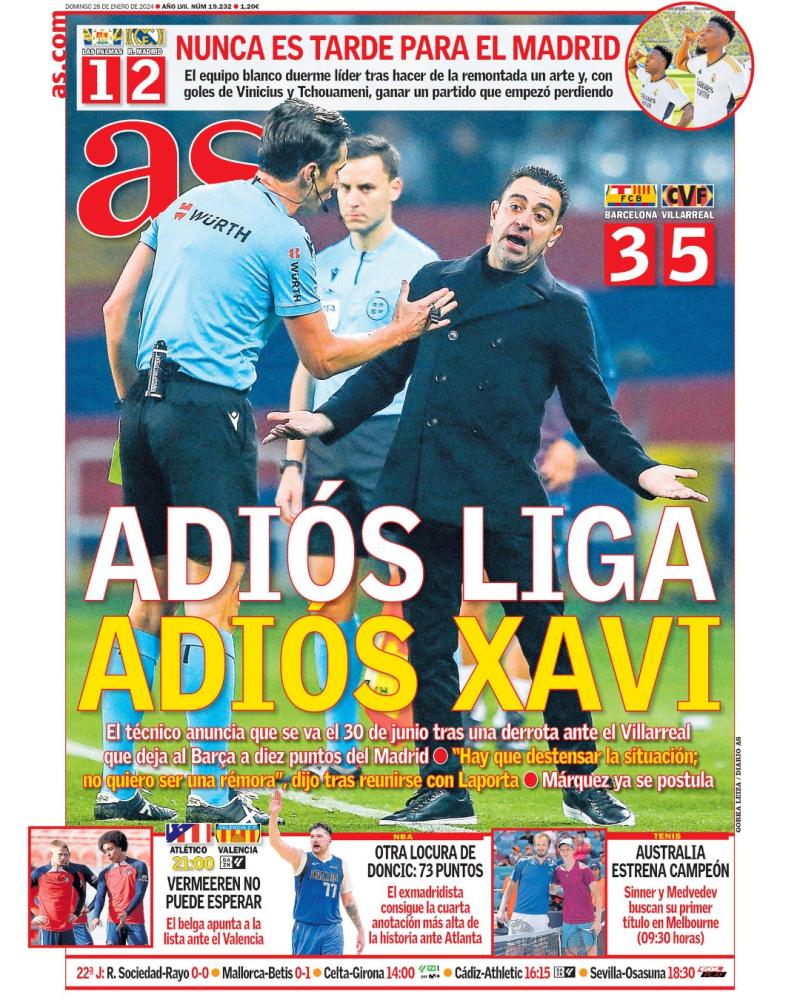 Este domingo 28 de enero de 2024, el diario as saca en portada la nueva derrota del FC Barcelona ante el Villarreal (3-5), y la decisión de Xavi Hernández, quien ha anunciado que no seguirá al frente del equipo culé la próxima temporada. Asimismo, el periódico también destaca la victoria del Real Madrid ante Las Palmas.