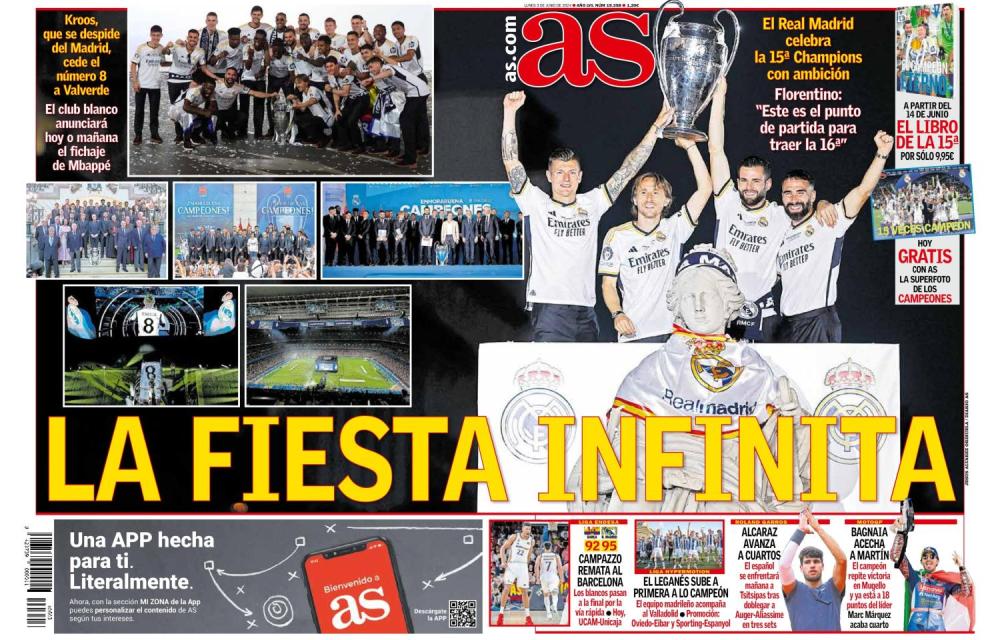 En su portada de hoy, 3 de junio de 2024, AS ensalza la Decimoquinta Copa de Europa del Real Madrid. Los de Carlo Ancelotti levantaron una nueva Champions League junto a sus aficionados. Cibeles y el Santiago Bernabéu, puntos de unión de la gran familia madridista.