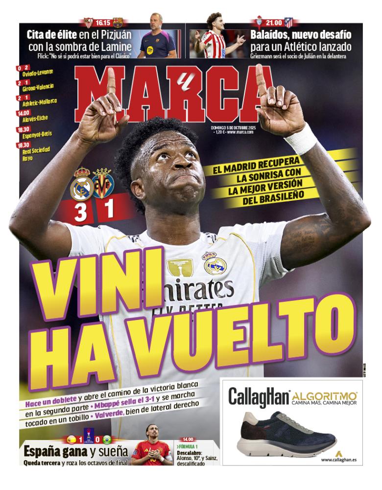 "Vini ha vuelto": el Real Madrid - Villarreal, en la portada de Marca